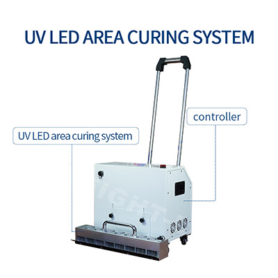 The UV-LED curing system adopts the LED lighting method, include controller and portable uv led head,with 395nm wavelength, curing area is 520x15mm, fast curing for the uv paint and uv ink on floor,the bottom is equipped with wheels for easy movement。